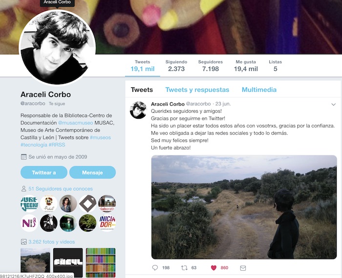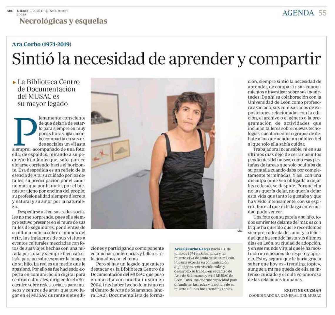 «Hoy se nos ha ido una parte muy importante del alma del Musac. Araceli Corbo, responsable de la Biblioteca-Centro de Documentación, nos deja huérfanos de una gran profesional esencial en la actividad del museo, pero sobre todo, deja el hueco irremplazable de un ser humano excepcional. Permanecerá en nosotras la huella imborrable de tu entusiasmo, tu buen hacer, tu amor a la vida, tu sonrisa y tu cariño, que han desbordado los muros de este centro para convertirse en parte luminosa de la cultura de esta ciudad, de esta región, de este país. Trabajaremos cada día para mantener vivo tu legado. Te queremos, compañera.»
