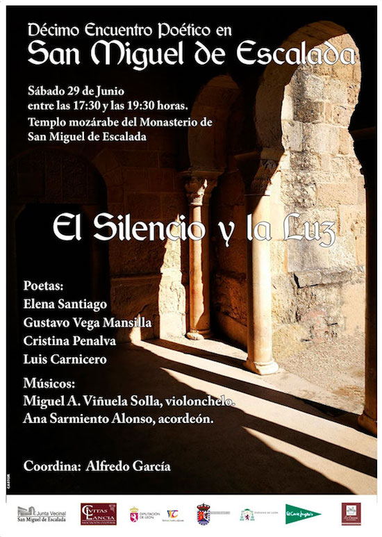 El antiquísimo templo mozárabe del Monasterio de San Miguel de Escalada (León) acogerá el sábado 29 de junio, entre las 17:30 y las 19:30 horas, como cada año por estas fechas desde hace ya dos lustros, un encuentro poético en el que, en esta ocasión, participarán los poetas: