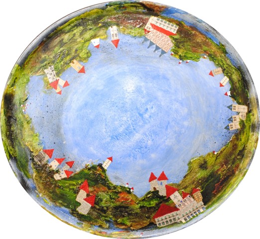 La obra de Carlos Pérez, ‘Ciudad Imaginaria’, representa un paisaje urbanizado que juega con la sinuosidad y abultamiento del objeto, simulando la vista de una claraboya o un espejo convexo. El paisaje imposible aparenta no tener principio ni fin y entremezcla técnicas como el collage y la pintura acrílica. Sobre esta pieza su autor asegura que le gustaría que su parabólica supusiera un mensaje limpio que ayudara a que algunos se diesen por aludidos.