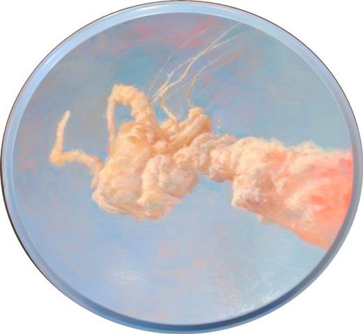 Por su parte, Lemuel Quiroga representa en ‘Columna de Humo’ una escena que, si bien podría parecer un cúmulo de nubes sobre un cielo azul, es en realidad el momento del estallido del Transbordador Challenger en 1986, aclara Elena Gómez Menéndez. “El juego de colores en tonos pastel encubre y atenúa el motivo principal de la escena, cambiando por completo la sensación que produce en el espectador”.