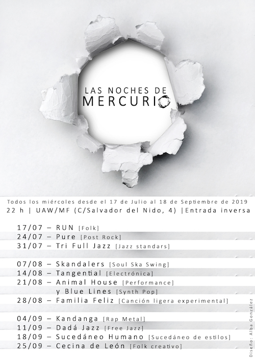 Los conciertos se realizaran en la sede la asociación UAW/MF —situada en la calle Salvador del Nido 4, local—. Todas las actividades darán comienzo a las 22 horas de cada miércoles; pudiendo acceder a la sala a partir de las 21 horas. Se ruega puntualidad.