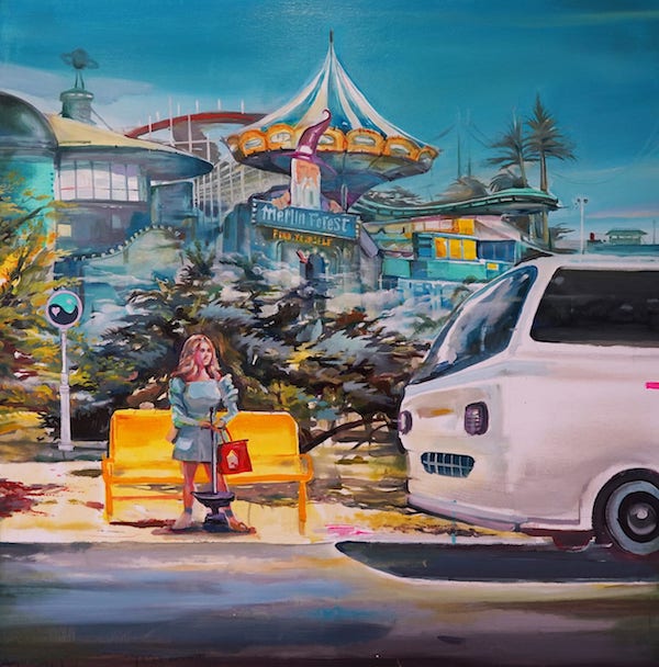 «Hay una búsqueda de la apertura a otros universos, y de sentir la pintura como un oficio», explica el artista, añadiendo que ha concebido estas obras «como una colección de cromos o estampas de un viaje imaginario en el que resuenan ecos de la cultura popular estadounidense de los años 70 80 y 90», aunque también reconoce que los lugares que se muestran en los cuadros son «tan lejanos que podrían no pertenecer a nuestro planeta».