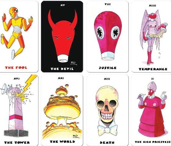 Los ochenta naipes de Miguel Ángel Martín introducen en el mundo mágico del Tarot su visión realista y pornográfica de la existencia, con vibradores (dildos), cúters afilados (knives), jarras calavera (skulls) y el vil metal (intis) iconos claves para descifrar el universo tan particular del dibujante leonés. Y entre ellos no podrían faltar sus máscaras y la figura del Devil, el personaje que cobró vida con la irreverente serie ‘Simpatía por el Devil’ publicada en Tam Tam Press y laureada en Italia. “No he querido poner rostro a los Arcanos Mayores. No me interesa ponerles cara porque, entiendo, es más importante el concepto en sí mismo”. Sexo, muerte y poder, los motores del mundo, son las raíces de la obra del gran autor de cómic español, tal como lo subraya Reino de Cordelia “La fuerza de sus imágenes no solo potencia la adivinación, también permite al brujo -ya sea profesional o aficionado- formular sólidos conjuros para atraer el amor, librarse del daño enemigo o alcanzar la suerte”.