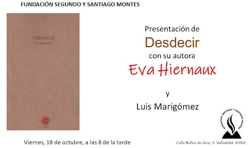 La Fundación Segundo y Santiago Montes (C/ Núñez de Arce, 9), en Valladolid, acogerá este viernes 18 de octubre, a las 8 de la tarde, la presentación de ‘Desdecir’, un libro de poemas de la artista multidisciplinar y poeta visual madrileña Eva Hiernaux. La autora estará acompañada por el escritor vallisoletano Luis Marigómez. Entrada libre.