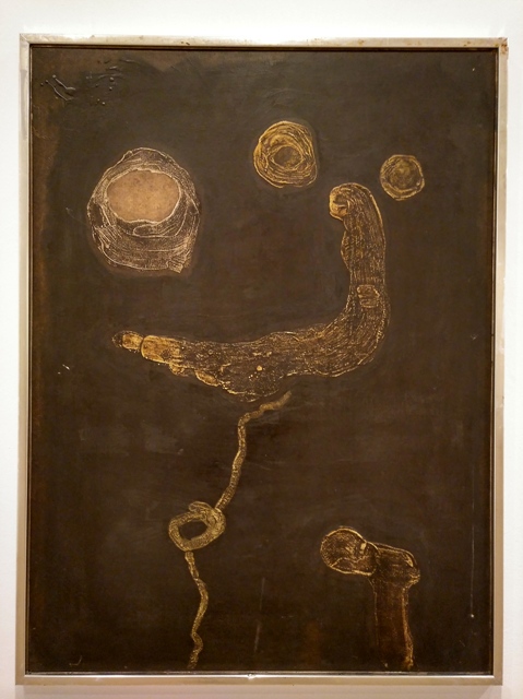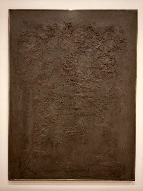 Ya en los años setenta, su pintura con respecto al color se hace más clara y luminosa utilizando una gama amplia de tierras y aunque sigue manteniendo un sentido monocromo, introduce variaciones tonales, leves contrastes de color que son producidos por la elaboración de texturas en el plano pictórico, así como por el tratamiento de pigmentación diferencial en la superficie. En este tipo de obras que se mantienen en el ámbito de la abstracción matérica, se potencia de una forma clara la creación de una amplia gama de texturas que se consiguen con la utilización de gubias y que nos produce la sensación de estar ante una superficie pétrea o terrosa que ha sido sometida a un efecto de erosión permanente. Es en este momento la ocasión adecuada para recordar el interés que Andrés Viloria ha demostrado por la arqueología, así sus obras nos recuerdan en algunos casos a modelos iconográficos y restos de las culturas más ancestrales. Gran parte de las pinturas de este periodo presentan un desarrollo iconográfico muy recargado y complejo que produce en su pintura un cierto barroquismo, si bien es cierto que existen excepciones como es el caso de la obra ‘Espacio con motivo II’ (1974), la cual está realizada con una gran sencillez partiendo de una simetría axial que distribuye la composición formada por signos esquemáticos que se distribuyen sobre una amplia superficie plana que ocupa la mayor parte del cuadro. En este tipo de obra, Andrés Viloria nos propone un acercamiento humano cargado de una profunda afectividad con relación al tema de la huella, la ruina, la permanencia y la evocación del hombre a partir del resto o el residuo, motivo este de reflexión y de gran importancia en su pensamiento.