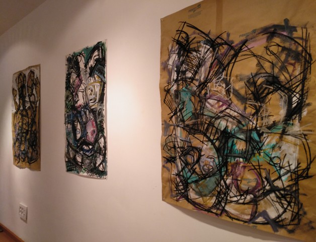 La Idea de transitoriedad, de modificación, de cambio e incluso desaparición, se refuerza por parte del propio artista en la utilización del soporte de la obra, al elegir unos materiales de máxima pobreza y propios de actividades comerciales, como es el papel continuo de bovina de embalaje y el cartón, dos soportes de gran fragilidad, débiles, degradables y de escasa durabilidad o permanencia temporal, condenados en cierto modo a la desaparición. Al mismo tiempo, en la aplicación compositiva y cromática incorpora materiales muy poco estables, como el carboncillo o los esmaltes industriales, mezclando productos de comportamiento y reacciones muy dispares que aceleran este deterioro, cuestión que refuerza esa idea inicial de implicar en la propia creación de la obra el componente de deterioro, desgaste e incluso me atrevería a decir muerte latente, aspectos que refuerzan la idea de cambio y tránsito en su obra, aunque sea a la desaparición total. En este sentido me recuerda mucho a algunos planteamientos del gran creador Pablo Maojo, que parte de fragilidad, levedad y brevedad de la existencia de algunas de sus obras, al utilizar algunos materiales concretos como la madera en obras públicas (‘El muro de las lamentaciones’, Museo Evaristo Valle).
