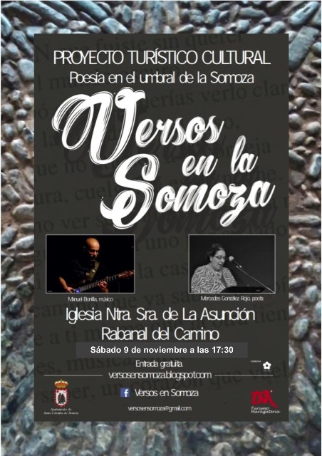 La escritora maragata Mercedes G. Rojo y el luthier y músico madrileño Manuel Bonilla, afincado en Priaranza de la Valduerna (León) ofrecen este sábado 9 de noviembre un recital en la iglesia Nuestra Señora de la Asunción de Rabanal del Camino. Será dentro del II Ciclo de Versos en la Somoza, a partir de las 17:30 horas.