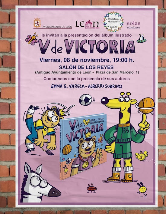 Este viernes 8 de noviembre, a las 19.00 horas, el Salón de los Reyes del Antiguo Ayuntamiento de León acogerá la presentación del libro infantil «V de Victoria» escrito por Emma S. Varela, ilustrado por Alberto Sobrino y editado por Eolas Ediciones. Los autores contarán el cuento, escrito en rima, y recomendado para niños y niñas de hasta 7 años.