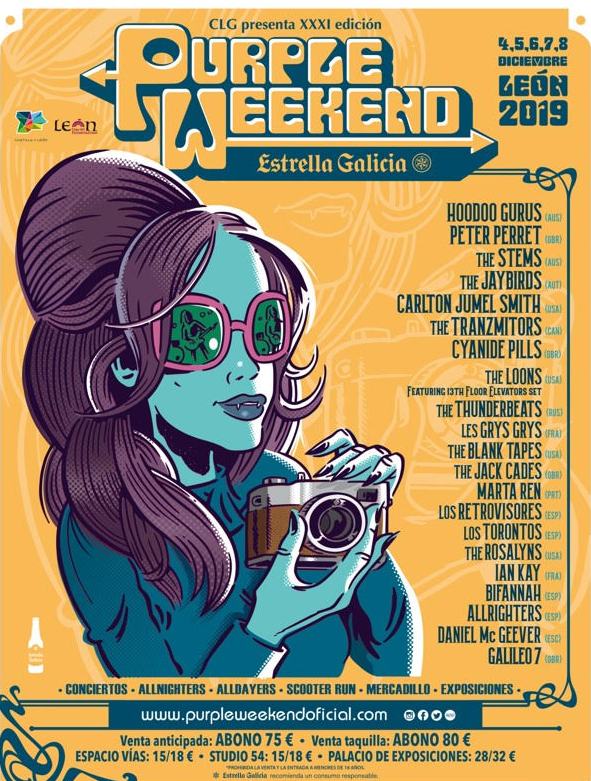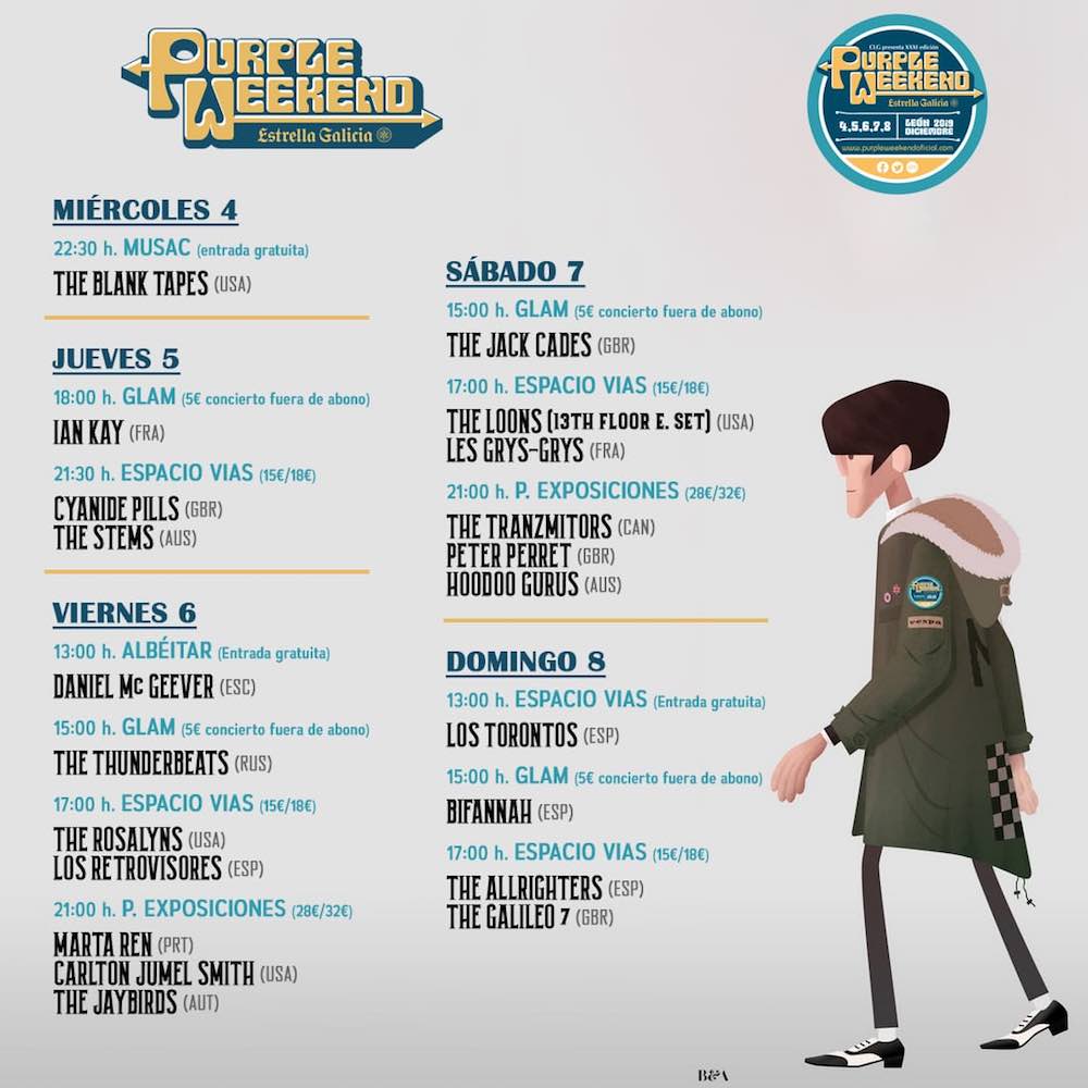 Durante cuatro días estas serán algunas de las grandes bandas que pasarán por las tablas del Purple Weekend 2019: Hoodoo Gurus (Australia), The Jaybirds (Austria), The Stems, Peter Perrett (UK), Carlton J. Smith (USA), Tranzmitors (Canada), Cyanide Pills (UK), The Jack Cades (UK), The Thunderbeats (Rusia) y Mr Tall & Mr Small (Belgica) entre otros.