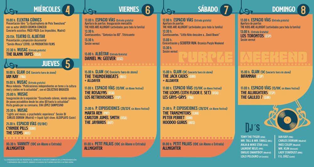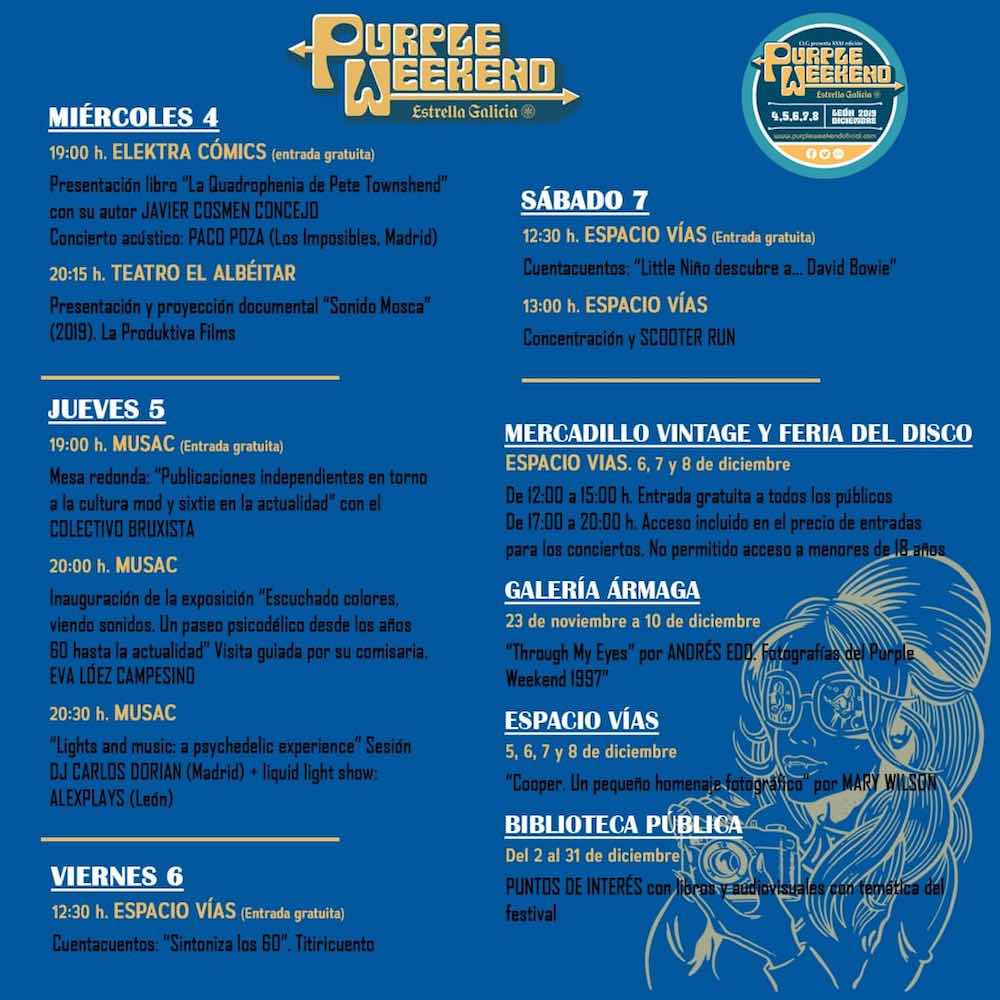 Del 4 al 8 de diciembre de 2019 el Purple Weekend cumple nada menos que 31 años. Esta gran fiesta de la cultura sixtie volverá a llenar la ciudad de León de música, patillas, parkas y scooters. Como novedad este año, el Palacio de Exposiciones será uno de los escenarios del festival mod, sustituyendo al CHF, que ya no formará parte en esta nueva edición.