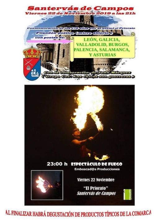 «Este viernes 22 de noviembre, la localidad de Santervás de Campos (Valladolid) se viste de fiesta, se pondrá sus mejores galas para recibir un elenco literario que por primera vez juntará en un FILANDÓN POÉTICO a poetas de León, Galicia, Valladolid, Asturias, Salamanca, Palencia y Burgos, aparte de poetas de otras provincias que acudirán de manera individual. Será a partir de las 21 horas en el Priorato (convento-iglesia), junto al museo de Ponce de León que visitaremos.