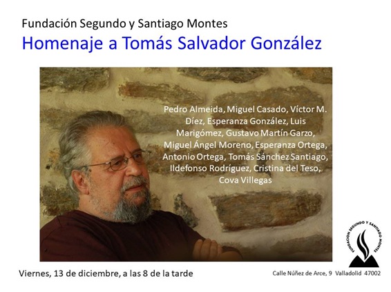 La Fundación Segundo y Santiago Montes (Valladolid) acogerá un homenaje al fallecido profesor, poeta y escritor zamorano afincado en Arenas de San Pedro (Ávila) Tomás Salvador González, en el que participarán sus compañeros de la revista El Signo del Gorrión y otros amigos y amigas. Será el viernes 13 de diciembre, a las 20 horas, y en el acto se presentará su último libro, póstumo, y se inaugurará una muestra de su poesía visual.