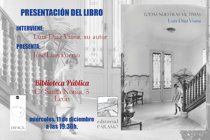 La Biblioteca Pública de León acogerá el miércoles 11 de diciembre, a las 19:30 horas, la presentación de la novela Todas nuestras víctimas, del antropólogo, poeta y escritor Luis Díaz Viana, coeditada por los sellos Difácil y Páramo. «Una novela sobre las cuentas pendientes con la memoria que aún tiene este país». Con el autor estará el también poeta y escritor José Luis Puerto.