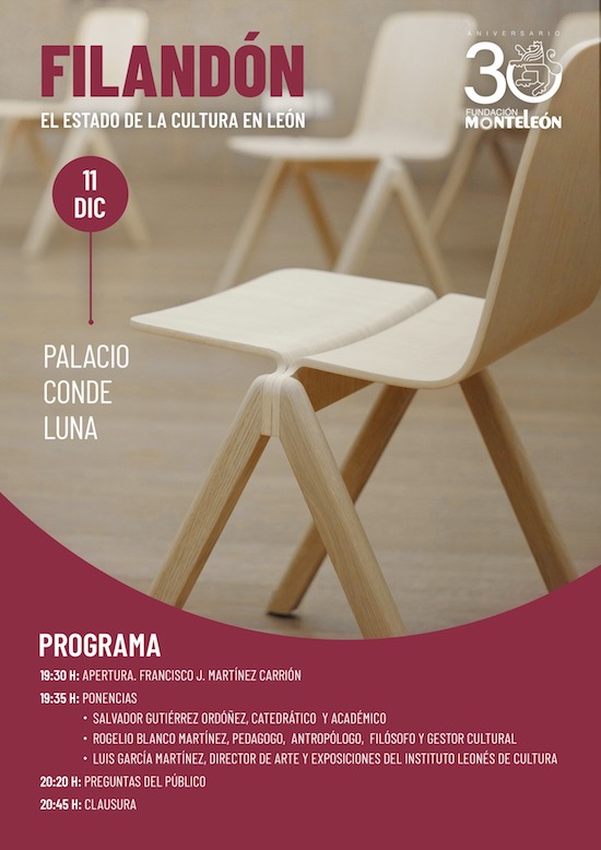 La Fundación MonteLeón cerrará el miércoles 11 de diciembre su programación especial en conmemoración de su 30 aniversario con un nuevo Punto de Encuentro, esta vez bajo la fórmula del Filandón tradicional leonés, para debatir sobre «El estado de la Cultura en León». Participarán Salvador Gutiérrez Ordóñez, catedrático y académico de la RAE; Rogelio Blanco, pedagogo, profesor, gestor y ex director general del Libro; y Luis García, director de Arte y Exposiciones del Instituto Leonés de Cultura. El Palacio del Conde Luna acogerá este Filandón, a partir de las 19:30h. Entrada libre.