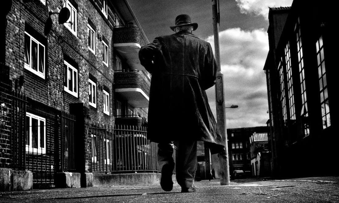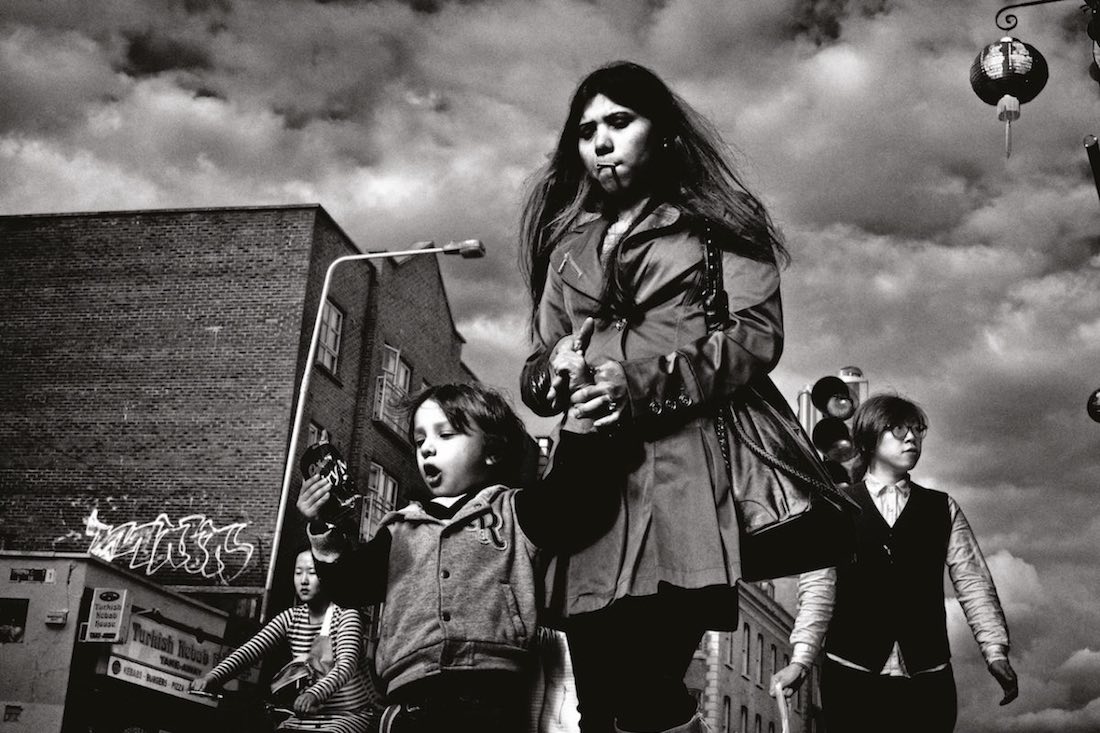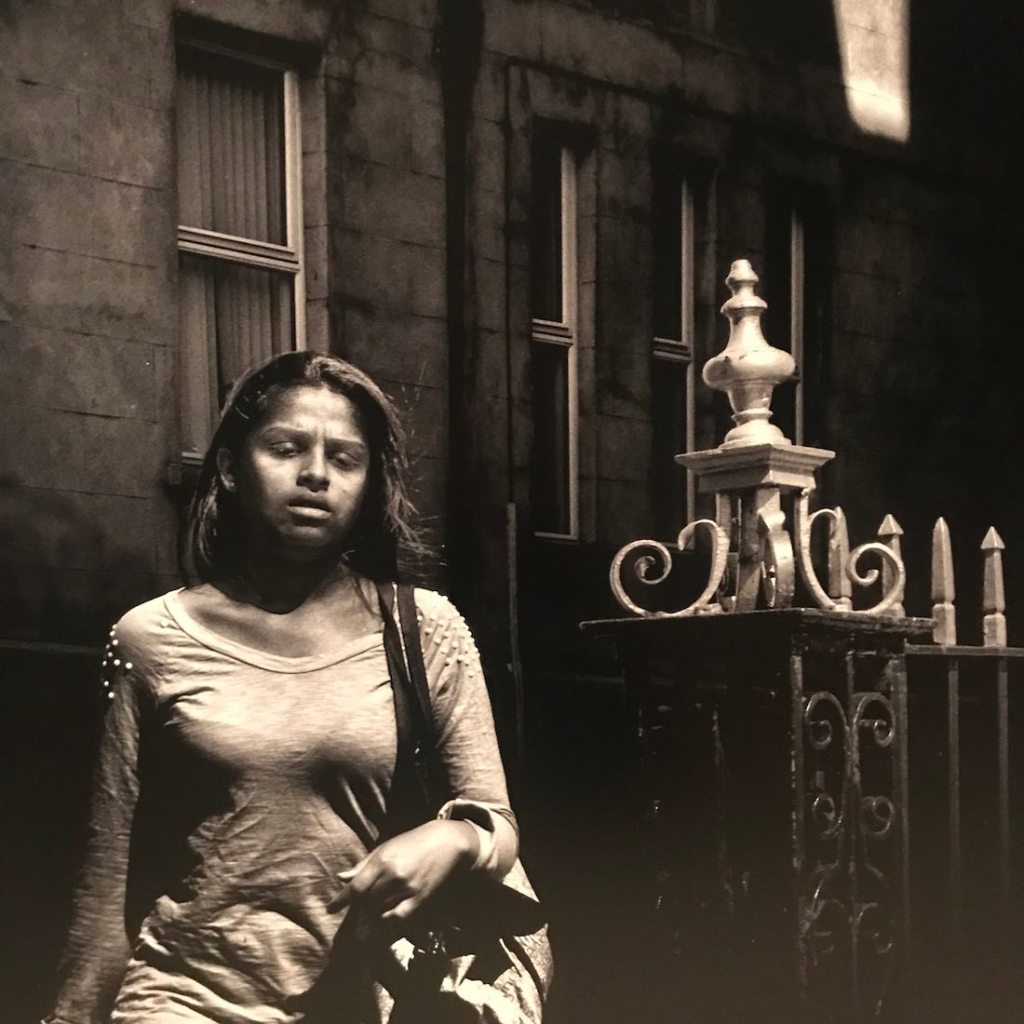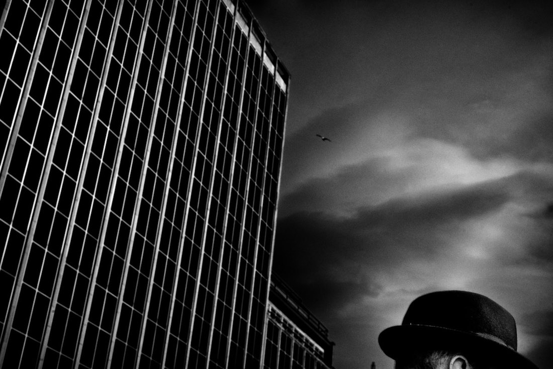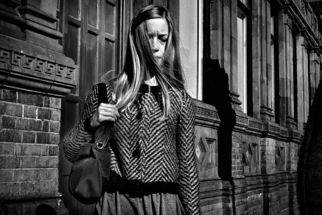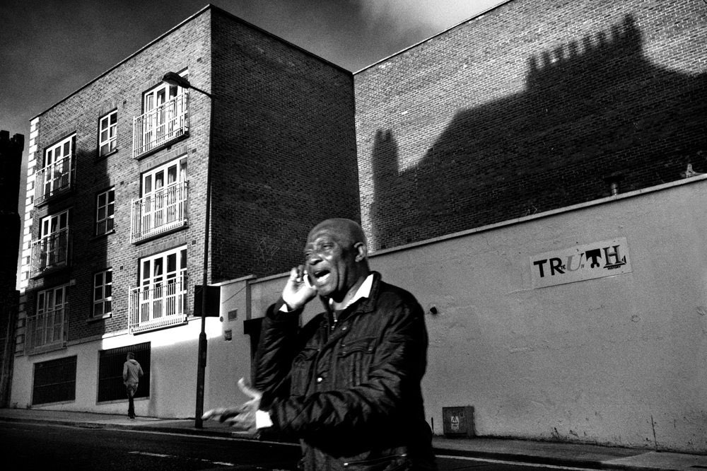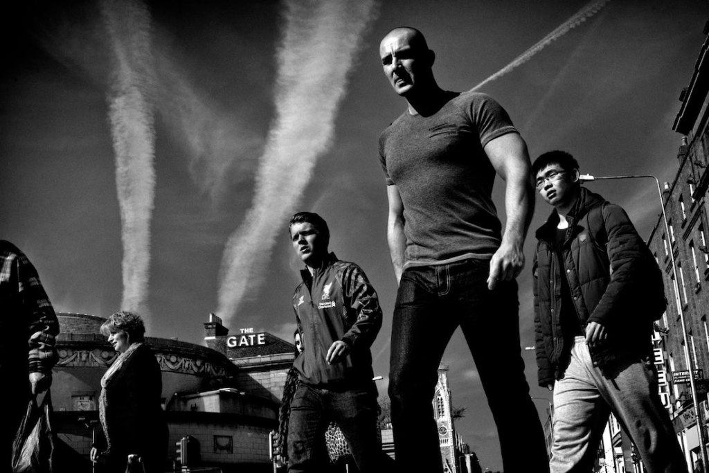 La exposición abarca más proyectos, algunos muy diferentes entre sí, trabajos muy personales que poco o nada tienen que ver con esta denominada “Trilogía de Dublín”. Sorprende ver a toda esa gente con su gesto adusto e incómodo andando, cruzando calles y aceras casi siempre con prisa, a la carrera, envueltos en la vorágine urbana. El fotógrafo busca enfoques forzados, muchos contrapicados, gente de espaldas, composiciones atrevidas, rostros enmarcados sobre fondos de hormigón o cielos tempetuosos. No es condescendiente con su cámara, es directo y severo con los de su entorno, sus gentes tienen la misma dureza que la turbulenta ciudad en invierno, no hay clemencia.