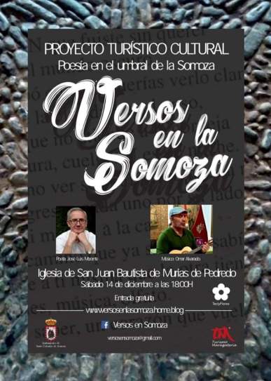 ‘Versos en la Somoza’, el proyecto turístico cultural que pretende dar visibilidad al entorno rural llega a su tercera edición este sábado 14 de diciembre en Murias de Pedredo (León). Los protagonistas de este nuevo ciclo son el poeta y escritor José Luis Morante y el músico Omar Alvarado. La cita tendrá lugar a las 18:00 horas en la Iglesia Parroquial de San Juan Bautista.