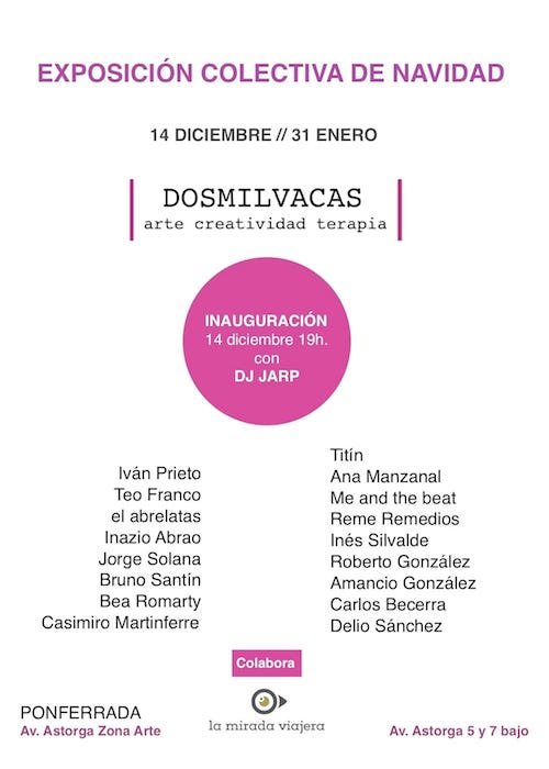 «Para que regales y te regales arte». Diecisiete artistas participan en la Colectiva de Navidad que este sábado 14 de diciembre se inaugura en Dosmilvacas, una galería de arte ubicada en Ponferrada, entre Galicia y León, junto al campus universitario, y que extiende sus exposiciones hasta el espacio vecino La Mirada Viajera (todos ello en la Avenida de Astorga, #PonferradaZona Arte).