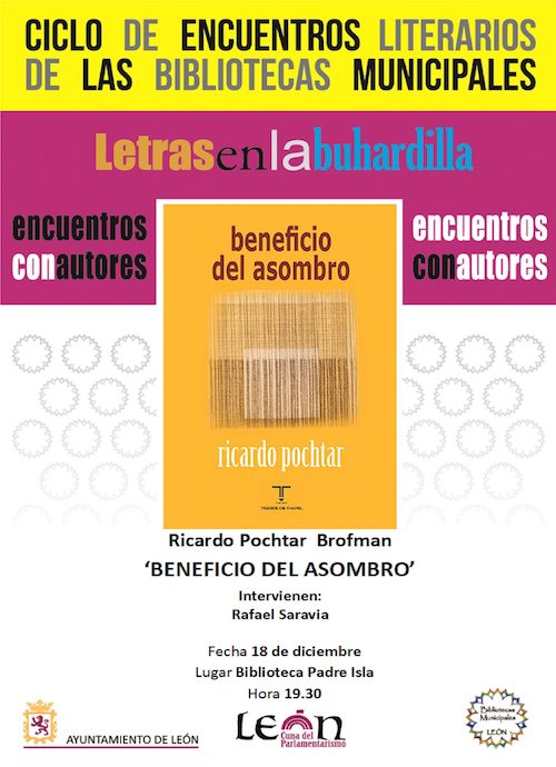Este miércoles 18 de diciembre a las 19:30 horas, dentro del ciclo «Letras en la Buhardilla», el poeta argentino afincado en Asturias Ricardo Pochtar estará en la biblioteca Padre Isla, acompañado por el coordinador del ciclo, Rafael Saravia.