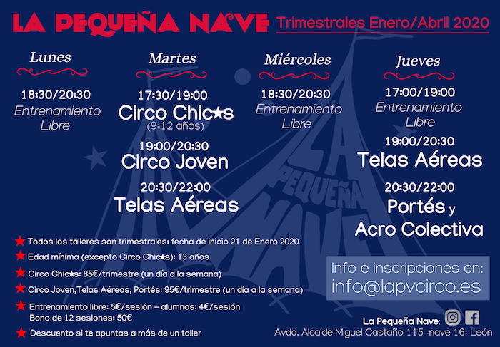 La Pequeña Nave, espacio de circo de León, abre las inscripciones para los talleres —de circo joven, telas aéreas, portés y acrobacia grupal— que se impartirán durante el trimestre enero/abril 2020, y que empezarán el martes 21 de enero. También se oferta espacio y horarios para el entrenamiento libre.