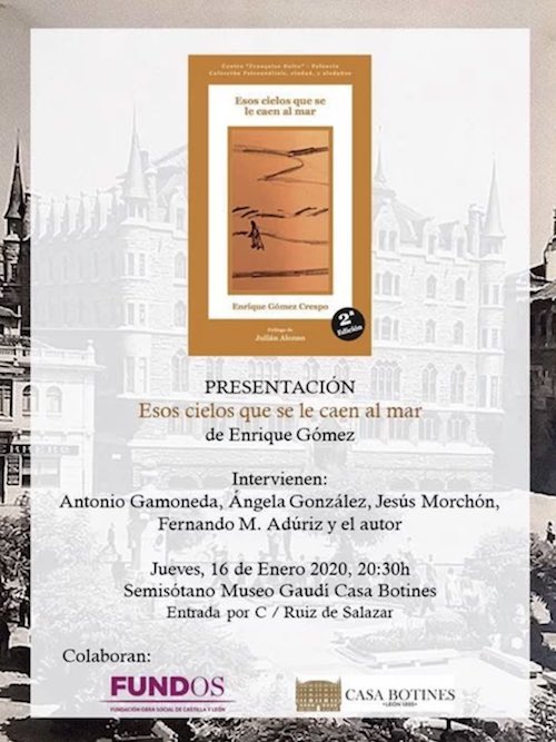 El Museo Gaudí Casa Botines (León) acogerá este jueves 16 de enero, a partir de las 20:30 horas, la presentación de ‘Esos cielos que se le caen al mar’, el nuevo poemario de Enrique Gómez, vicepresidente del Ateneo palentino. José María Viejo, director de la Fundación Obra Social de Castilla y León (Fundos), y el editor Diego Adúriz, serán los encargados de ejercer como maestros de ceremonias. En la presentación intervendrán el poeta Antonio Gamoneda, el psiquiatra Jesús Morchón y los psicoanalistas Fernando M. Adúriz y Ángela González.
