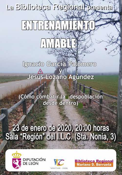 Este jueves 23 de enero, la Sala Región del Instituto Leonés de Cultura acogerá, a las 20 horas, la presentación del libro «Entrenamiento amable», del que son coautores Ignacio García Palomero y Jesús Lozano Agúndez. Hablarán de «cómo combatir la despoblación desde dentro», pero también de otras formas «amables» de vivir, e incluso de hacer política. Entrada libre.