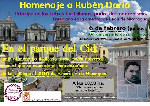 Los poetas de León rendimos homenaje a este «poeta universal, padre y maestro mágico», en palabras del escritor y especialista en este poeta, Carlos Midence, embajador de Nicaragua en España, que ha enviado unas palabras para leer en el acto que se celebra este jueves día 6 de febrero a las 18’30 horas en el parque del Cid, también conocido como «parque Romántico», junto al monolito que representa al Príncipe de las letras castellanas. Es una celebración común en todos los países de habla hispana.