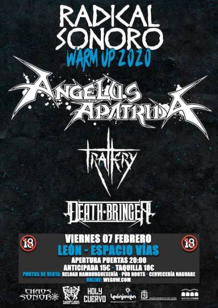 El Festival Radical Sonoro 2020 de León presenta un interesante cartel para el mes de mayo y tendrá además su anticipo, en forma de Warm Up, este viernes 7 de febrero, con la actuación tres sensacionales bandas de thrash/death metal: Angelus Apátrida, Death Bringer y Trallery. Será a partir de las 20 horas en Espacio Vías (junto a la estación de Feve). Entradas: 15€ anticipada y 20€ en taquilla.