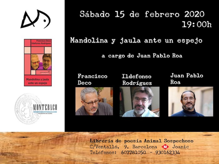 ‘Mandolina y jaula ante un espejo’, un experimento poético materializado en cien poemas breves del sevillano Francisco Daco y el leonés Ildefonso Rodríguez, se presentará en la librería de poesía Animal Sospechoso, en Barcelona, el sábado 15 de febrero de 2020, a las 19 horas. Los poetas autores estarán acompañados por el escritor y traductor francés Jean-Yves Bériou, autor del prólogo del libro, y por el editor, poeta y librero Juan Pablo Roa.