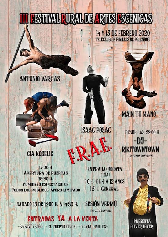 Por tercer año consecutivo, el Teleclub de la pequeña localidad segoviana de Pinillos de Polendos (51 habitantes, según datos del INE a 2018) acogerá el innovador Festival Rural de Artes Escénicas (FRAE), muy esperado por vecinos y visitantes. En esta ocasión tendrá lugar los días 14 y 15 de febrero (viernes y sábado), con dos sesiones iguales, una cada día. «Por mantener los pueblos vivos y sus gentes felices», reza el lema del FRAE.