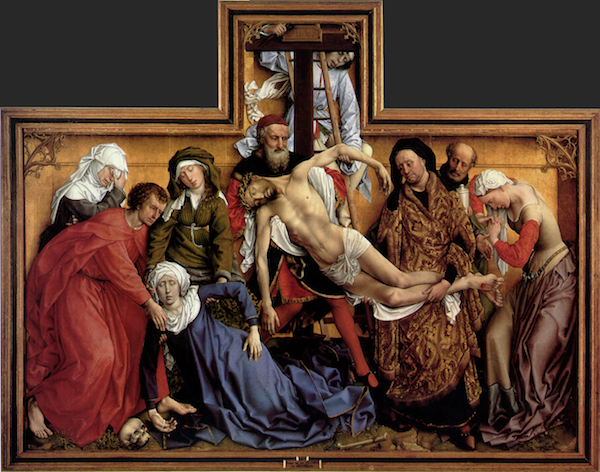 Y es que lo latente también es presencia. Estamos ante una figuración liberada. Realidad interior. El propio Carralero Carabias explicó que al pintar no se planteaba en qué estilo o género encuadrar lo que estaba haciendo: “Lo mismo me pasa con la pintura de los demás. Mi cuadro preferido de toda la historia de la pintura es El descendimiento de la cruz, de Rogier van der Weyden”, a lo que el poeta asintió con una sonrisa y un movimiento de cabeza: “¡No has dicho nada!”, exclamó. En efecto, esta tabla flamenca, datada antes de 1443, es real sin ser realismo, aparecen un espacio y un tiempo subjetivos, con su propia coherencia, liberados incluso de la fidelidad geográfica y cronológica. ¿Acaso hay realismo en las manos entrelazadas de María Magdalena, en su distorsión imposible? No, pero son reales… es decir, verdad.