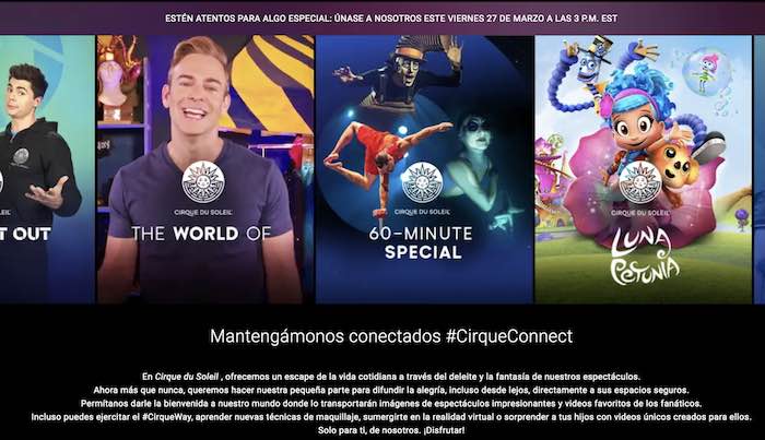 «En Cirque du Soleil, ofrecemos un escape de la vida cotidiana a través del deleite y la fantasía de nuestros espectáculos. Ahora más que nunca, queremos aportar nuestro granito de arena para difundir la alegría, incluso desde lejos, directamente a sus espacios seguros.