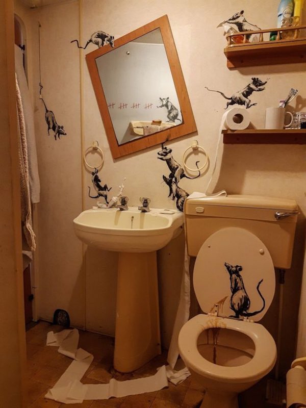 Banksy, el escurridizo artista y activista británico del street art, sobre cuya verdadera identidad casi nada se sabe, publicó el miércoles 15 de abril de 2020, en su página web y en su cuenta de Instagram, la imagen de su última obra, en la que muestra cómo las ratas causan el caos en un cuarto de baño durante el confinamiento por el coronavirus. En su web se pueden ver fácilmente, en galería con la imagen principal, otras cuatro fotos con fragmentos y detalles de la obra agrandados.