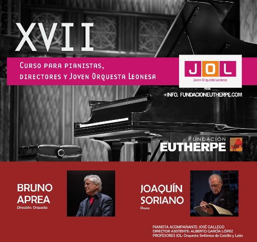 El director de orquesta Bruno Aprea y el pianista Joaquín Soriano son los maestros responsables desde hace dieciséis años, y de forma ininterrumpida, de este curso internacional organizado por la Fundación Euterphe (León), que en todas sus ediciones repartía las clases entre el Conservatorio Profesional de Música de la ciudad y el Auditorio de León y al que acudían como alumnos pianistas y directores de orquesta. La actual pandemia ha cambiado su rumbo y obligado a que se retrase un año, del 5 al 12 de septiembre de 2021, y se mantendrá el mismo programa previsto para este 2020.