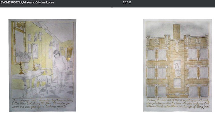 Otra de las obras más ambiciosas y en mi opinión más importantes de la artista, es la instalación “El Rayo que no cesa” (2015) que generó una estupenda exposición, “Manchas en el silencio”, celebrada en la sala Alcalá 31 en 2017. La pieza nace en el 75 aniversario del bombardeo de Guernica y trata de documentar, a lo largo de cinco años de trabajo con un buen número de colaboradores, todos los bombardeos sobre población civil que se han producido desde el comienzo de la historia de la aviación. Se genera una enorme base de datos representada estéticamente en tres pantallas en las que se va generando por una parte un mapa de los bombardeos, en la pantalla central, mientras en las otras dos aparecen los detalles de cada uno de ellos y una imagen del lugar bombardeado.