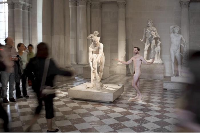 La última serie que quiero mencionar está también cargada de sentido del humor. “Invisible Nude” parte de la normalidad con la que las obras artísticas de desnudos cuelgan en las paredes de los museos, pero donde el desnudo real es siempre conflictivo y cuestionado. La acción desarrollada por la artista consiste en fotografiar las perfomances que desarrollan los y las modelos en los principales museos del mundo, que entran en una sala determinada y se quedan desnudos, dialogando con alguna de las piezas que cuelgan en la pared de la sala y siendo rápidamente expulsados por la seguridad. Además de lo más obvio, Cristina Lucas pone el foco en los museos con la intención de llamar la atención sobre la progresiva transformación que están sufriendo, convirtiéndose en “espacios de ocio” y lo que ella considera más peligro, en lugares que contribuyen a las operaciones especulativas del mercado del arte.