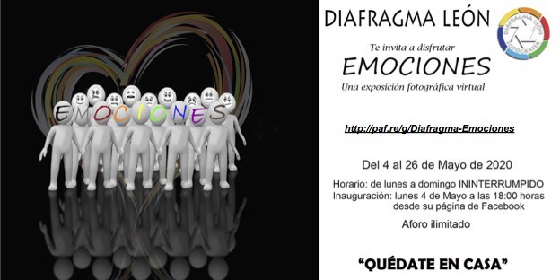 Adaptándose a las nuevas y excepcionales circunstancias en las que nos encontramos por la pandemia de la Covid-19, el Colectivo Diafragma León ha organizado una experiencia novedosa: una exposición fotográfica virtual. La muestra podrá visitarse en la Red del 4 al 26 de mayo de 2020, de lunes a domingo en horario ininterrumpido y con aforo ilimitado, a través del enlace http://paf.re/g/Diafragma-Emociones.