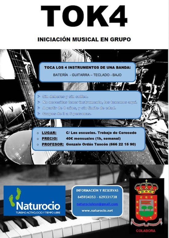 El guitarrista leonés Gonzálo Ordás Tascón te lo pone fácil, desde su taller de iniciación musical en grupo «TOK4», con sede en las antiguas escuelas de Trobajo del Cerecedo, a las afueras de León capital. A partir de 8 años y sin límite de edad. Sin necesidad de tener instrumento, ya que puedes usar los que hay en el taller. El precio: 40 euros al mes (una clase a la semana, de una hora de duración) por alumno/a. En grupos de 3 a 6 personas. Si te interesa, inscríbete ya (teléfono: 666 221 590). Las primeras clases arrancan este mes de junio y continuarán durante todo el verano...
