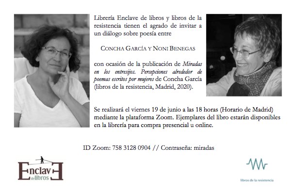 La librería madrileña Enclave de libros y libros de la resistencia (el sello que dirige Edmundo Garrido) han organizado un diálogo sobre poesía con ocasión de la publicación de «Miradas en los entresijos. Percepciones alrededor de poemas escritos por mujeres» de Concha García (libros de la resistencia, Madrid, 2020). La autora dialogará con la poeta y crítica Noni Benegas, autora a su vez, entre otros libros, del reciente «Ellas tienen la palabra. Las mujeres y la escritura».