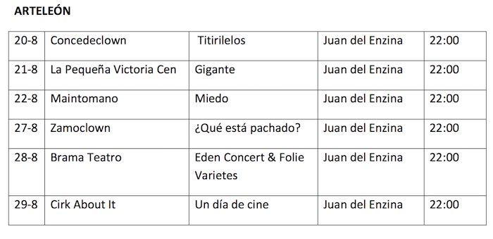 Dedicado a las artes escénicas y a la música, participan compañías locales de circo y clown como La Pequeña Victoria Cen, Cirk About, Concedeclown. Tendrá lugar los días 20, 21, 22, 27, 28 y 29 de agosto en el patio del IES Juan del Enzina a las 22.00 horas.