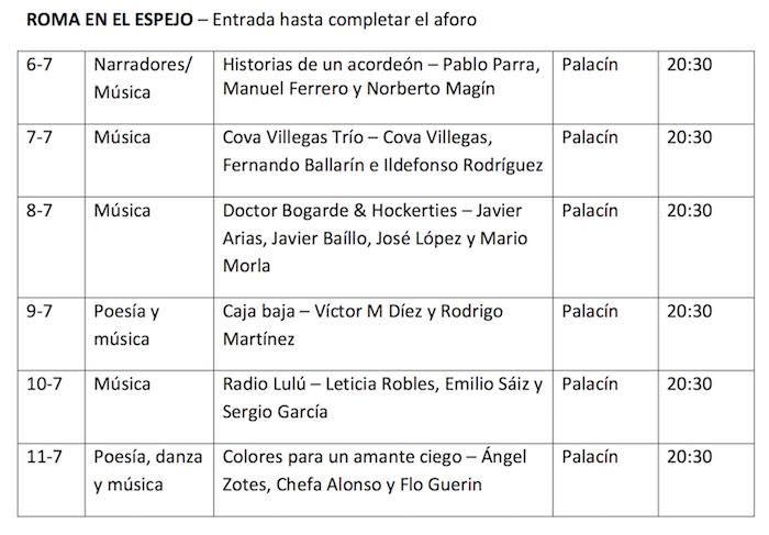 Este año 2020 se cumple la octava edición del programa cultural Roma en el Espejo, organizado por la asociación Improartes, que antes se celebraba en la cripta con restos romanos de la calle Cascalería, y que este verano se celebrará en El Palacín (detrás del Palacio de Exposiciones, antigua Azucarera de Santa Elvira), con propuestas artísticas que combinan la música, la poesía y la danza de la mano de artistas locales. Del 6 al 11 de julio. Las actuaciones y espectáculos comenzarán a partir de las 20.30 horas.