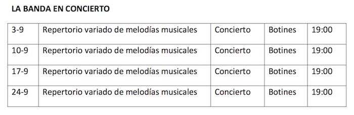 La banda de música de la ciudad interpreta un repertorio variado de melodías. Los conciertos se celebran en Botines durante las tardes de los jueves del mes de septiembre (días 3, 10, 17 y 24) a partir de las 19.00 horas.