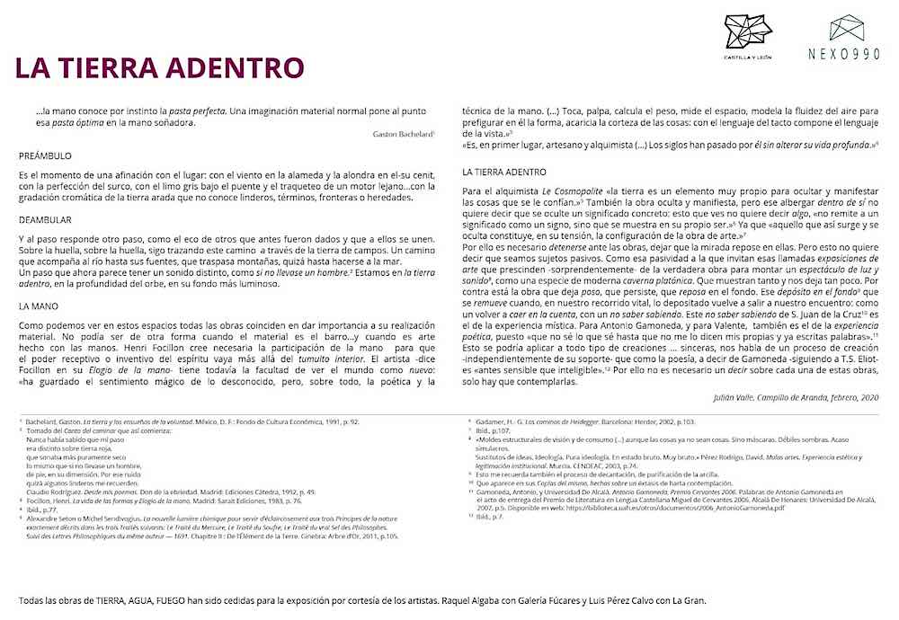 De esta forma, en una comunidad donde tanta importancia tuvo la alfarería como industria artesana —hoy en vías de extinción— hasta la década de los setenta del pasado siglo, se plantea una aproximación coral a un elemento que forma parte esencial de la identidad etnográfica, económica y cultural de nuestro medio rural, desde diferentes lenguajes, técnicas y disciplinas contemporáneas. Tal y como señala Julián Valle en el texto de la hoja de sala que acompaña la exposición “estamos en la tierra adentro, en la profundidad del orbe, en su fondo más luminoso”.