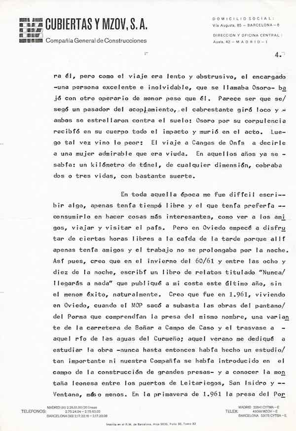 (…) Me limitaré, como es su deseo, a contarle en cuatro líneas mi época leonesa que desgraciadamente fue más breve de lo que yo esperaba entonces. Habiendo acabado la carrera y tras trabajar durante casi dos años en una oficina de proyectos en Madrid, comprendí con claridad que lo que me interesaba de mi profesión era la ejecución de obras y, a poder ser, en el campo. Creo que en marzo de 1956 ingresé en la entonces MZOV, hoy incorporada a CMZ, una Compañía que había construido el legendario ferrocarril Zamora-Vigo y que por aquellas fechas iniciaba unas obras en el canal del Jarama y otras en el Bierzo. A punto estuve de ser despachado hacia el Jarama, pero la suerte quiso que me enviaran a Ponferrada donde MZOV había contratado los canales de Quereño y Cornatel para la Empresa Nacional de Electricidad.