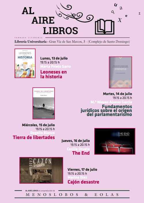 Marta Prieto Sarro, Nieves Alonso García, Rogelio Blanco, Cecilia Orueta y Marina Díez son los cinco autores que, en esta semana del 13 al 17 de julio, pasarán por la terraza literaria de la Librería Universitaria, para firmar ejemplares de sus últimos libros, en horario vespertino de 19:15 a 20:15 horas. «Al aire libros», es una iniciativa de los sellos editoriales Menoslobos (Mr. Griffin) y Eolas (Héctor Escobar).