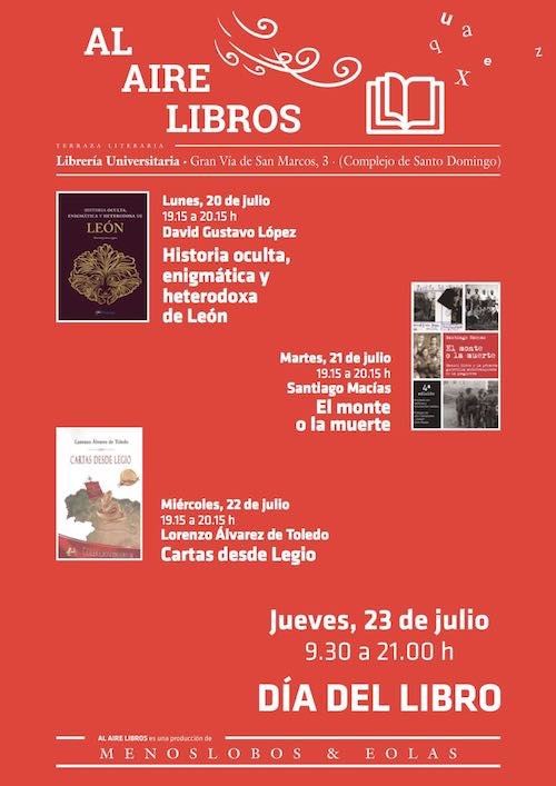 David Gustavo López, Santiago Macías y Lorenzo Álvarez de Toledo son los tres autores que, en esta semana del 20 al 24 de julio, pasarán por la terraza literaria de la Librería Universitaria, para firmar ejemplares de sus últimos libros, en horario vespertino de 19:15 a 20:15 horas. «Al aire libros», es una iniciativa de los sellos editoriales Menoslobos (Mr. Griffin) y Eolas (Héctor Escobar).