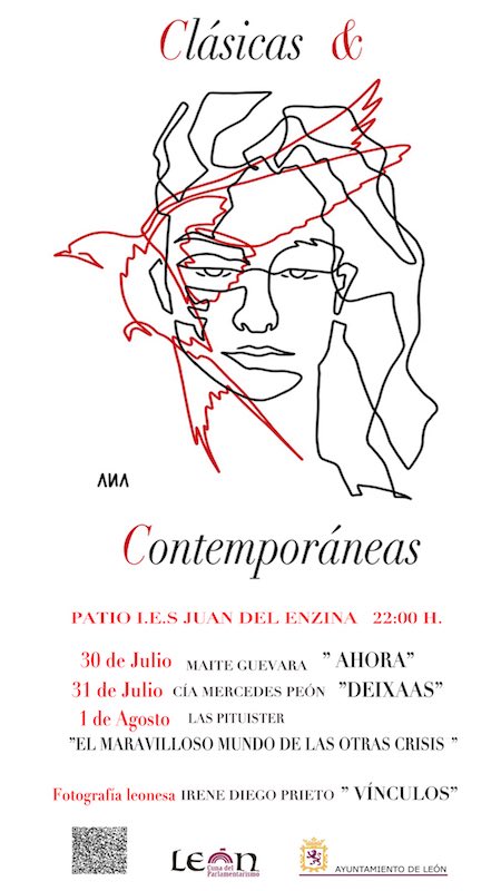 Tres espectáculos de clown (Maite Guevara), música (Mercedes Peón) y teatro cómico (Chus Gutiérrez y Maje Hernando, ‘Las Pituister’), y una exposición de fotografías (de Irene Prieto), componen el Festival Clásicas y Contemporáneas, organizado por el Ayuntamiento de León, que se celebrará los días 30 y 31 de julio y 1 de agosto, a las 22 horas y al aire libre, en el patio del IES Juan del Enzina. Con entrada gratuita previa recogida de invitación en el Auditorio Ciudad de León (de 9 a 14 horas) y una hora antes de cada actuación en el IES Juan del Enzina.