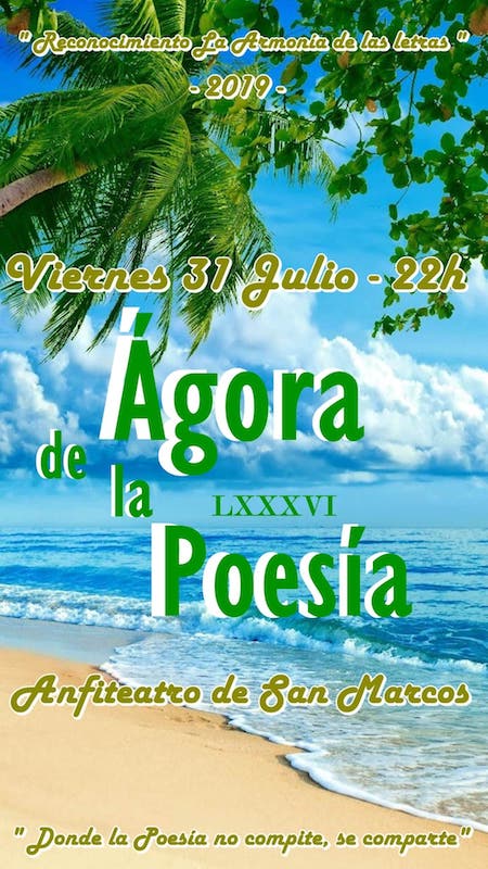 La poesía, como todo arte, es ¡al ataque!, ¡al ataque poetas!, poetas del alba. Seguimos con los versos a flor de piel, entre la realidad y la rima, con la penumbra de los tiempos y la metáfora. Obligatoria la mascarilla para liberar a los versos y no dejar que enferme la palabra ni nadie», dice el mensaje que envían los organizadores del Ágora este mes de julio.