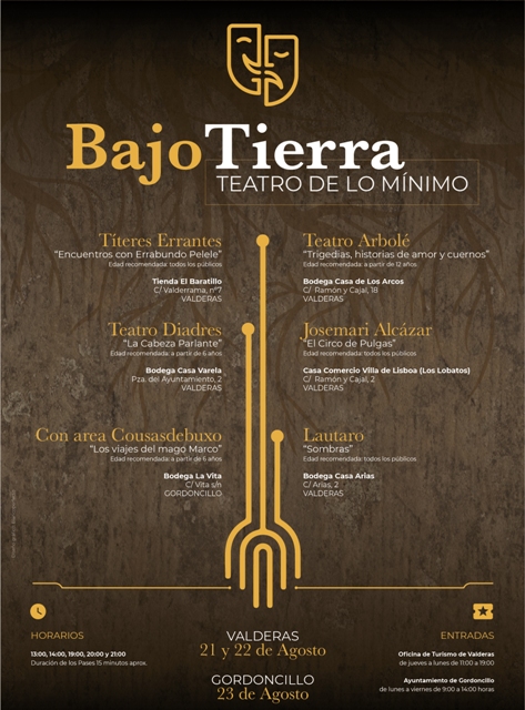 Las catedrales del vino, las bodegas, recobran protagonismo con este proyecto que pretende recuperar el valor de sociabilidad que siempre tuvieron estos templos ocultos bajo tierra. En ‘Bajo tierra. Teatro de lo mínimo’ participan seis bodegas de Valderas y Gordoncillo: las bodegas Tienda de Joaquín, Casa Varela, Casa de Los Arcos, Casa Arias y Casa Comercio de Villa de Lisboa, en Valderas, y la bodega Vita de Gordoncillo, que acogerán los montajes de seis compañías españolas. Durante los días 21, 22 y 23 de agosto, Títeres Errantes, Títeres Diadres, Teatro Arbolé, Josemari Alcázar, Lautauro y Con area Cousasdebuxo llevarán a escena sus distintos espectáculos, “muy dinámicos y dirigidos a un público familiar”, según señala el coordinador del proyecto Javier Cambero. Y contarán con cinco pases cada uno de ellos, a las 13.00, 14.00, 19.00, 20.00 y 21.00 horas. Tendrán una duración mínima de diez minutos y máxima de 20 para dotar una gran rotabilidad de público. “Es un festival pensado para disfrutar en familia, con el pretexto de ver los espectáculos programados mostraremos la arquitectura escondida de las bodegas que se encuentran en viviendas, en muchos casos solariegas y que forman parte de la historia de Valderas”.