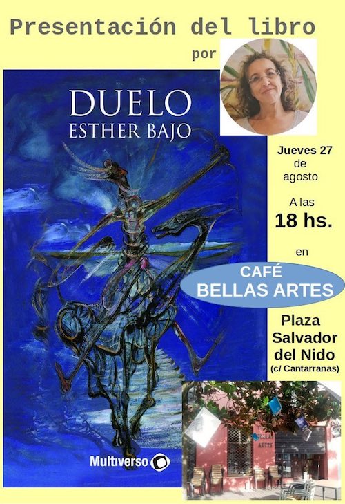 La periodista leonesa Esther Bajo presenta este jueves 27 de agosto su libro «Duelo» (Ed. Multiverso), concebido como «la expansión sentimental en verso de esta palabra en sus tres acepciones». Será a las 18 horas, en el café Bellas Artes (Plaza Salvador del Nido, en León, muy cerca de la catedral).
