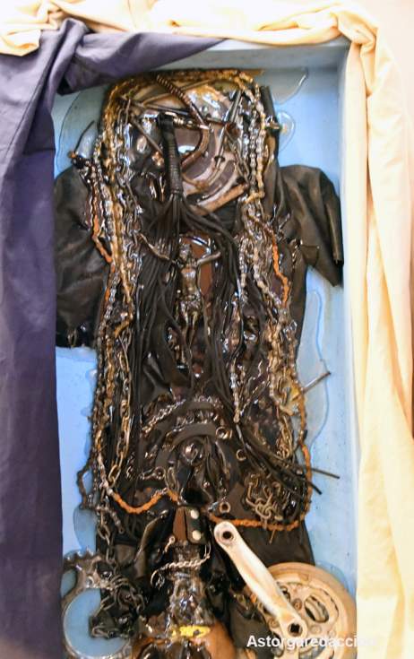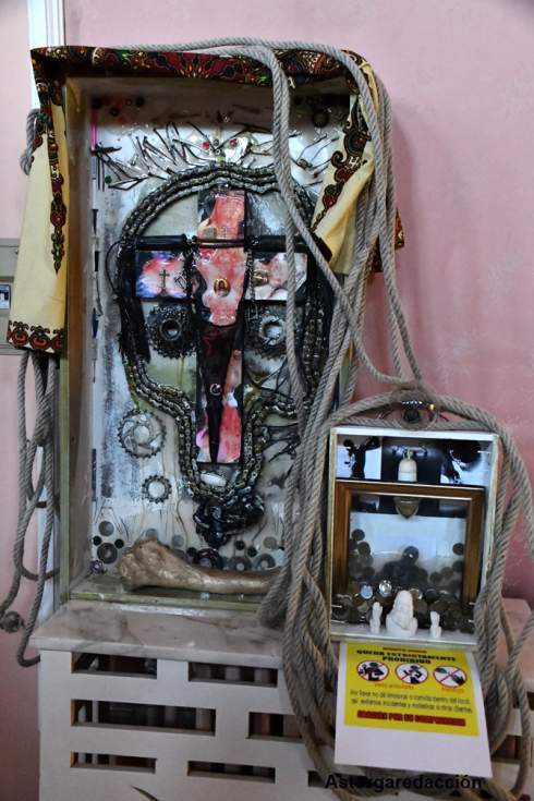 El crucifijo primero, enmarcado entre cadenas y catalinas de moto, me evoca un erotismo mecanizado con efluvios de Satán, le espeto. «Es así, me responde, es una denuncia. Yo me meto en mi oscuridad, la de mi herencia judeocristiana; pero tenemos ahí una pantallita, un ‘black mirror’ en el que estamos viendo imágenes pornográficas, que invade hasta a los niños pequeños. Y eso también lo quiero denunciar. Estoy trabajando ahí el tema tabú, el del fetiche, el de la oscuridad y el de la mecanización y desaparición de los sentimientos hasta ‘desemocionarnos’ y llegar a ser como robots biológicos. Yo he traído aquí todo lo que he hecho durante años». Ante el segundo Cristo agazapado en su mandorla de látigos y cadenas, incrustado en el torso de una mujer de negro, dice: «Una mujer, una dominatrix.»